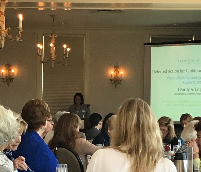 La Licenciada Glorily A. López presentó sobre la Acción Diferida para los Llegados en la Infancia (“DACA,” por sus siglas en inglés) para los miembros de TEMPO y sus invitados en el Madison Club el 8 de agosto de 2017. La Licenciada López les explicó a los asistentes el propósito original de DACA, quiénes son los “Dreamers” y qué necesitan saber los estadounidenses (incluyendo a los que viven aquí en Madison o en el condado de Dane) sobre el impacto de los potenciales cambios a las prioridades de inmigración bajo la administración de Trump. La presentación de la Licenciada López terminó con varias preguntas y comentarios interesantes de parte de los participantes de TEMPO. La presentación se encuentra aquí.